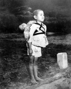 長崎原爆投下直後に撮影された、亡くなった弟を背負い、火葬場=crematoriumに立つ少年の写真。教皇は『戦争の結果』‘Fruit of war'というカードに書き世界に発信をしました。